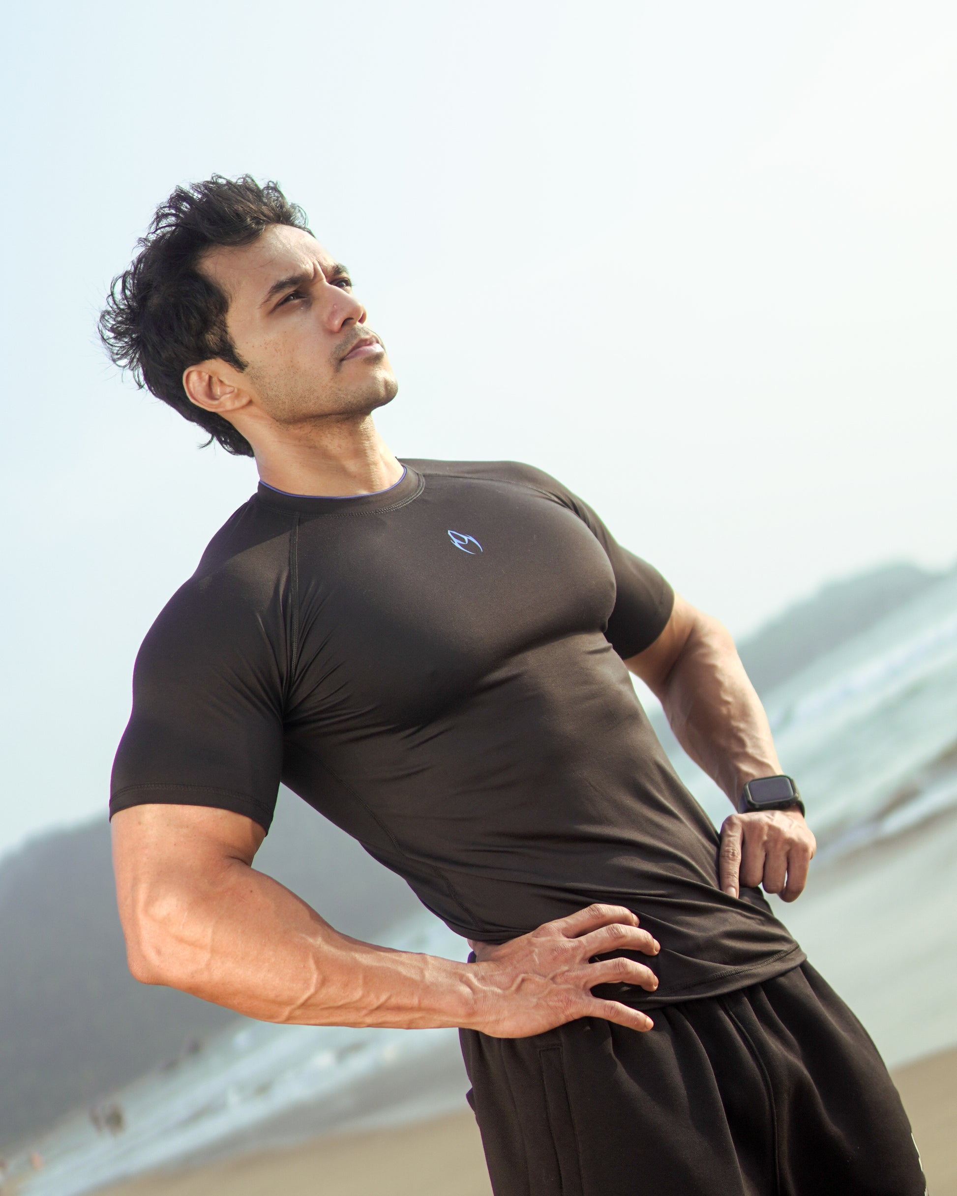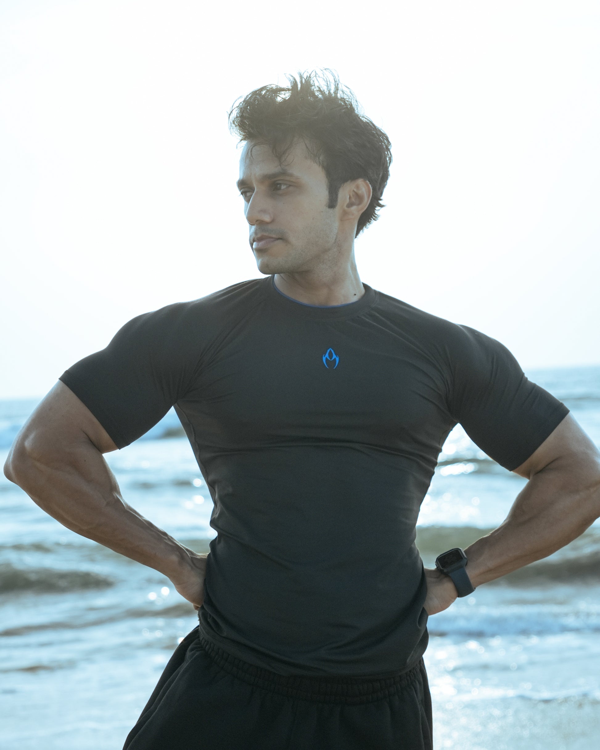 Life began in water, where stillness shifted into movement and movement became power. It shaped every form that rose after. Aqua is our way of returning to the source of all power. Our Aqua Compression T-shirt carries that origin in its design, marked by a unique blue rib that reflects the clarity and force of water. Engineered with KoolTech fabric, a blend of 90% polyester and 10% elastane at 180 GSM, it offers breathable compression fit, flexible stretch, and a clean athletic fit. Made to support your motion the same way water supported the beginning of life.